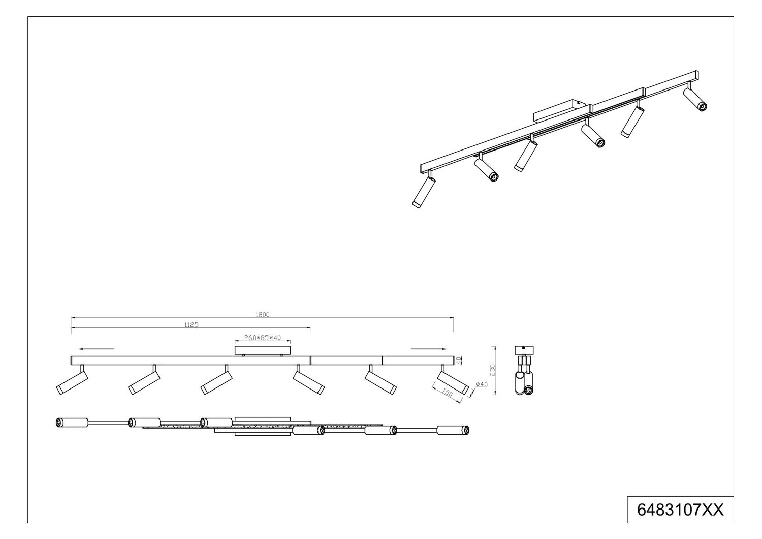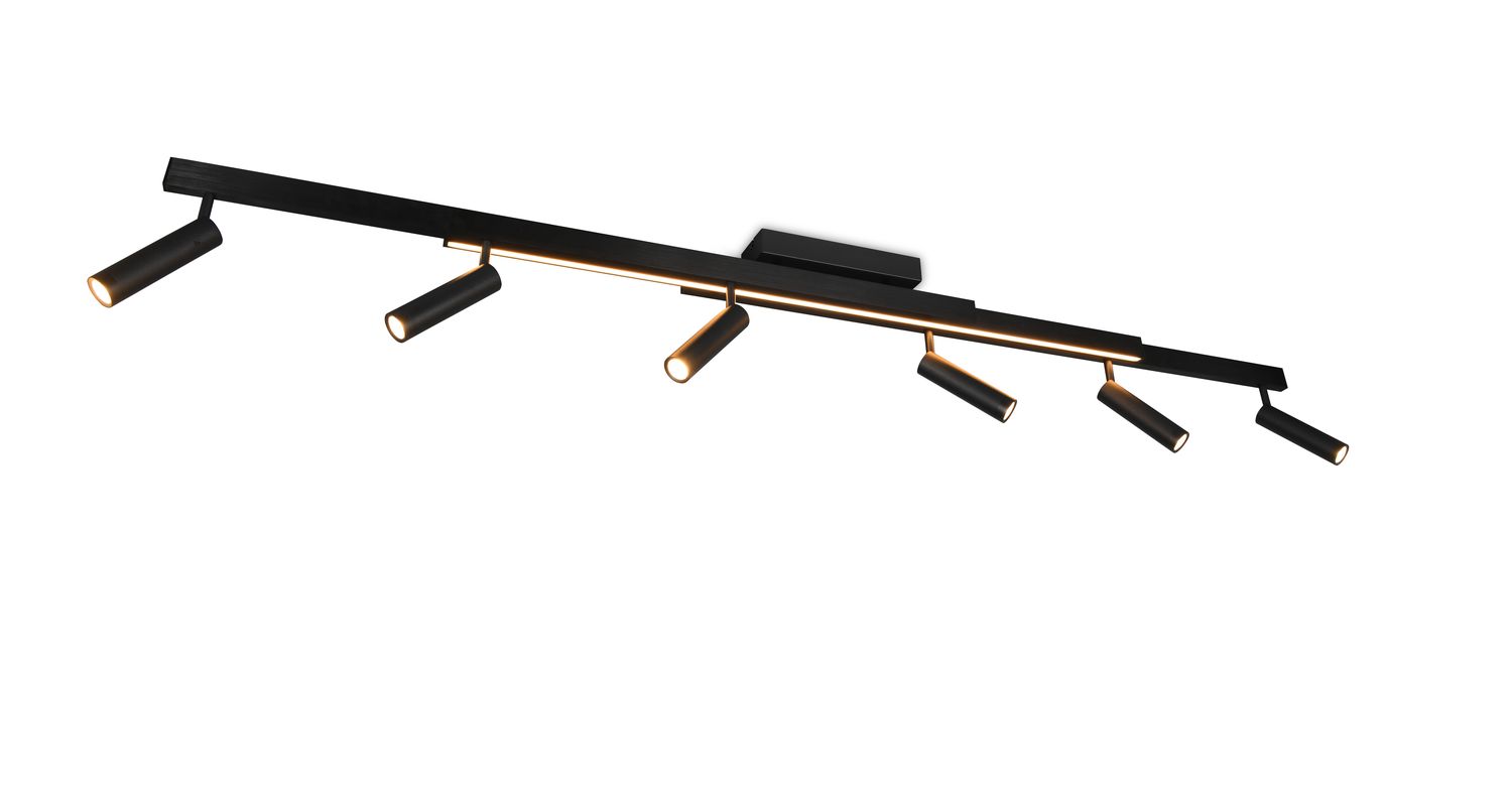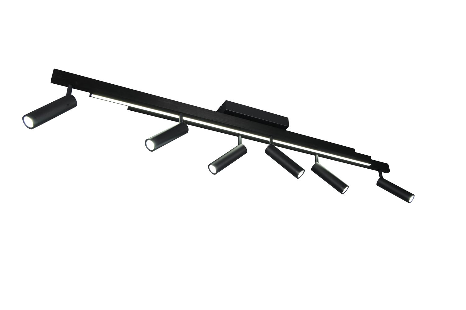Le plafonnier 6 spots ZENO se compose de 3 barres parallèles qui s'étirent jusqu'à 1,80m max. La télécommande permet de varier la puissance lumineuse et la teinte de la lumière. Il est possible d'allumer séparemment la barre lumineuse centrale des spots.