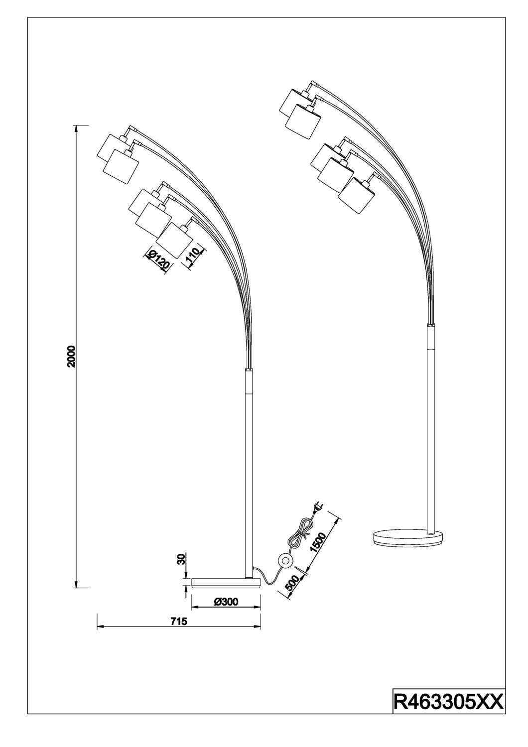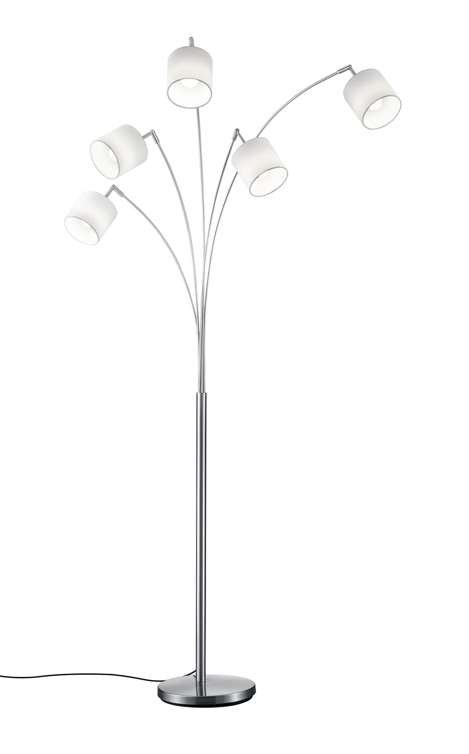 Un grand arc de lumière pour votre salonLe lampadaire TOMMY (R46330501) offre un large éclairage d'ambiance. Sa structure arquée en nickel mat atteint 200cm de hauteur et supporte 5 abat-jours cylindriques en tissu blanc.. Ce design épuré est idéal pour un intérieur moderne ou scandinave. Il est équipé d'un interrupteur au pied. Il fonctionne avec 5 ampoules E14 (non incluses). La série TOMMY combine des abat-jours en tissu et une structure en métal pour une ambiance chaleureuse. | Type d'ampoule | Sphérique E14 (non inclus(e)) | | Puissance | max.5*10W | | Variation | Non Compatible | | Alimentation / Normes | 220V/Cl2/IP20 | | Dimensions | 715* 2000 mm | | Matière(s) Principale(s) | Métal et tissu | | Couleur/Finition | Nickel mat/Blanc | | Position / Fixation | A poser | | Utilisation | En intérieur | | Accessoire(s) | | | Garantie | 2 ans |