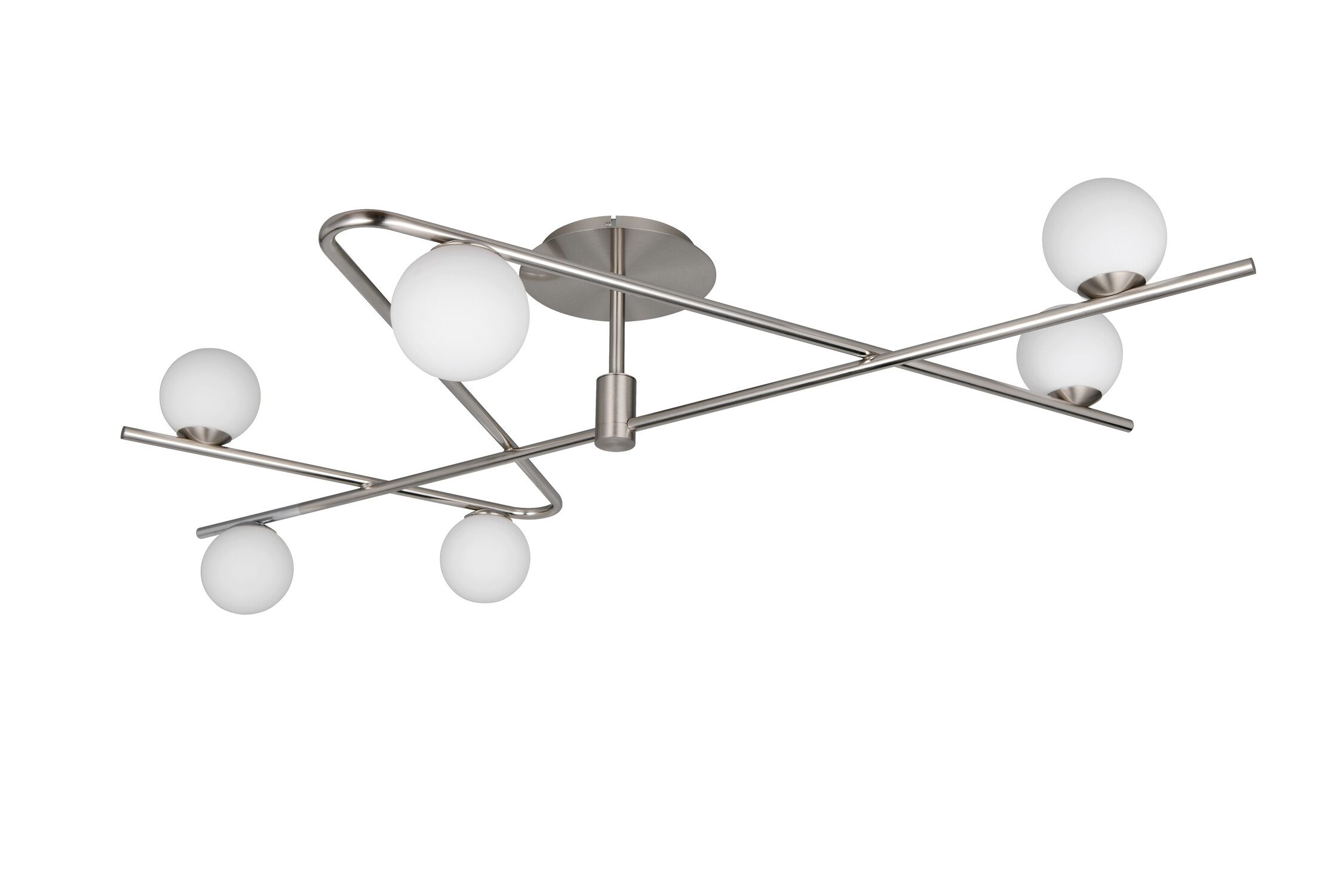 FLAMING : Plafonnier 6 Spots D'Ambiance - Nickel Mat / Verre Ce plafonnier FLAMING (668900607) est la version plafond de la suspension, idéale pour les pièces où la hauteur sous plafond est limitée. Il dispose de six diffuseurs en verre sur une structure en Nickel Mat qui assurent une distribution uniforme et chaleureuse de la lumière.. Son design discret, mais élégant, le rend parfait pour un salon ou une grande chambre à coucher. Il crée une ambiance d'éclairage d'accentuation et général très confortable. Nécessite six ampoules G9 (max 10W par ampoule, non incluses).