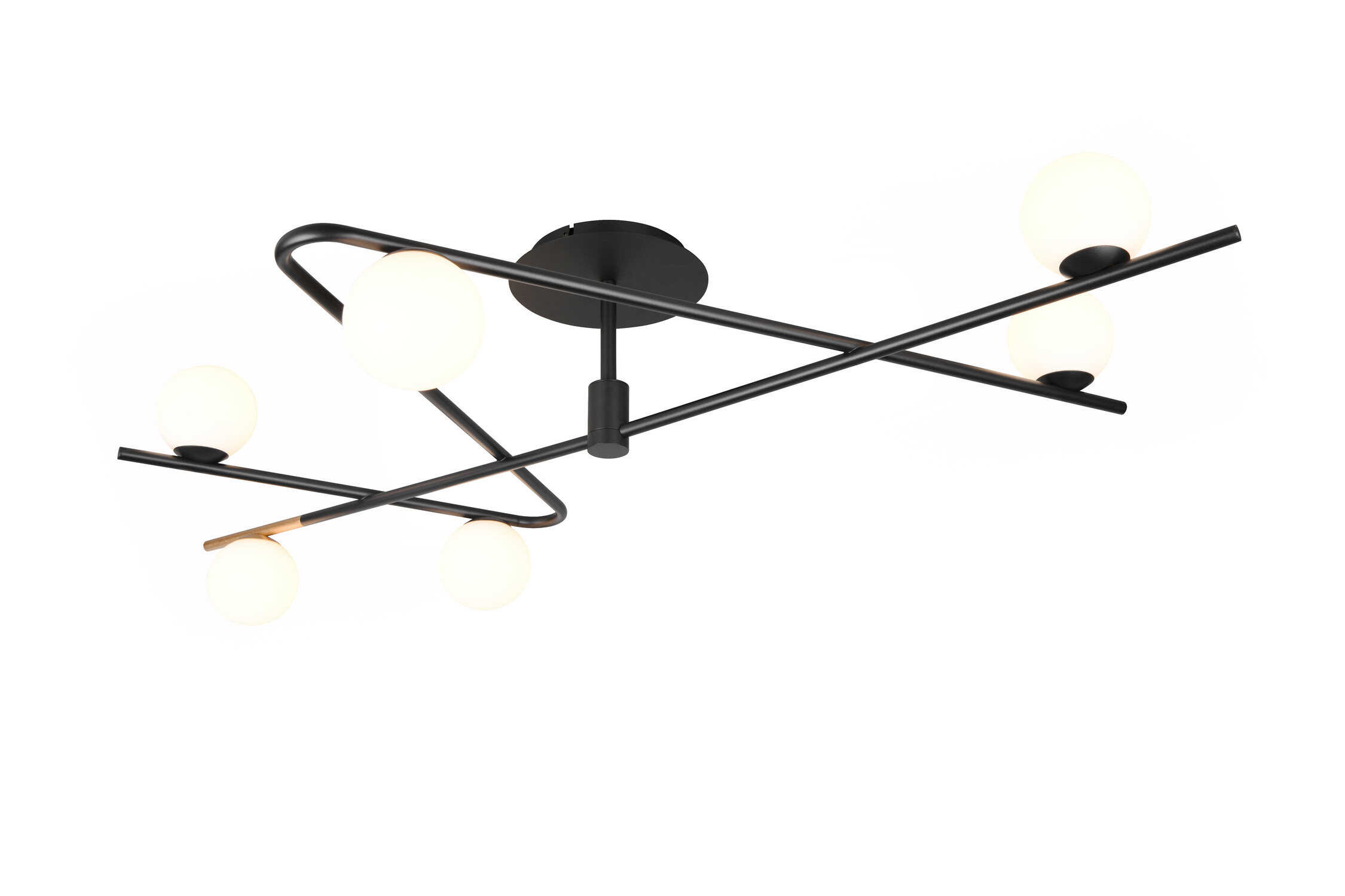 FLAMING : Plafonnier Chic 6 Spots - Noir et Or / Verre Le plafonnier FLAMING (668900680) est un luminaire au fort impact visuel grâce à sa finition bicolore Noir et Doré. Les six boules en verre adoucissent l'éclairage, le rendant parfait pour une installation dans un salon de standing ou une entrée majestueuse.. Il fournit un éclairage principal généreux tout en servant de véritable objet décoratif. L'élégance des matériaux et des formes en fait un excellent choix pour les intérieurs au style contemporain ou Art Déco. Nécessite six ampoules G9 (max 10W par ampoule, non incluses).