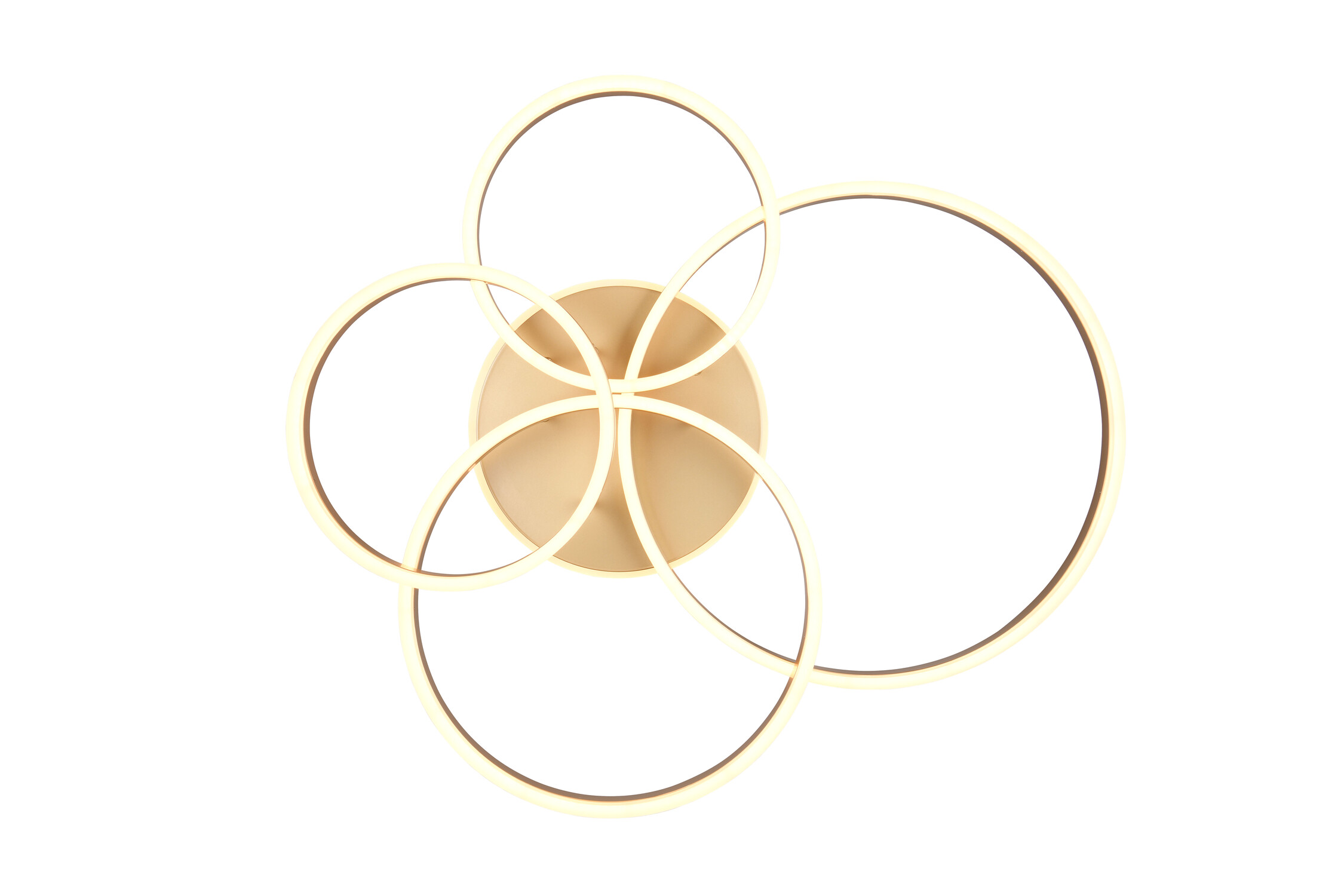 Le plafonnier TRIO DRAKE  se distingue par sa composition en 4 cercles lumineux au design graphique, fini Doré satiné, pour une mise en scène moderne du plafond.
