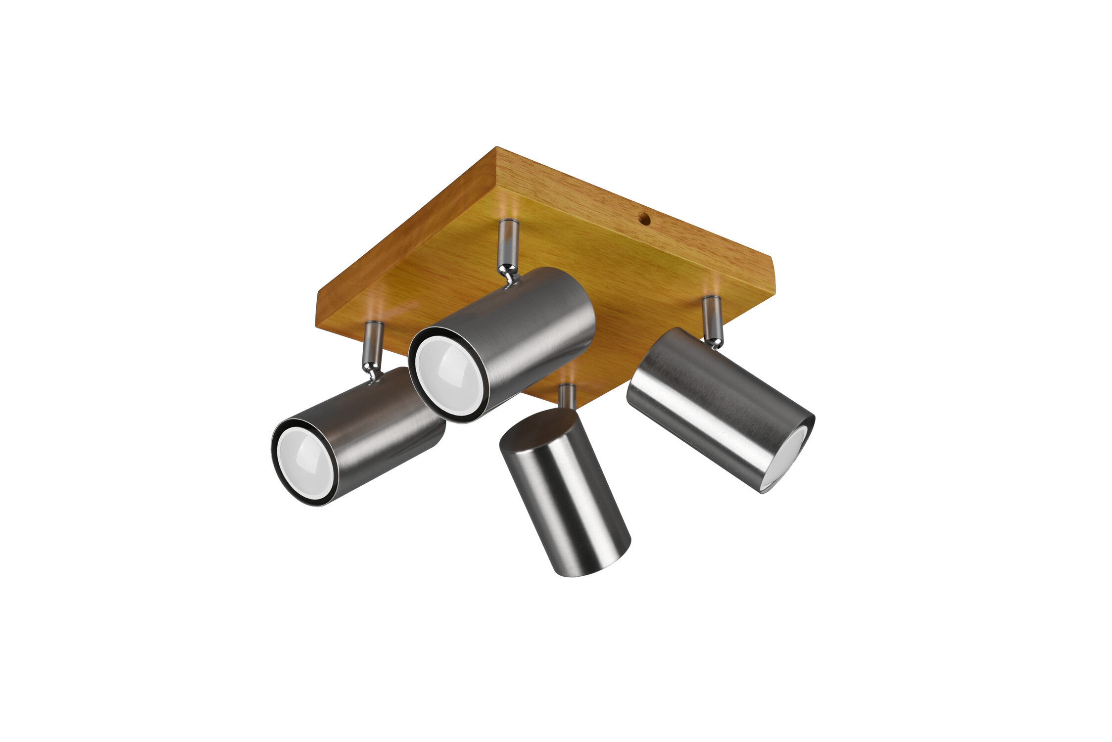 Plafonnier carré 4 spots polyvalents en Nickel Mat et Bois
