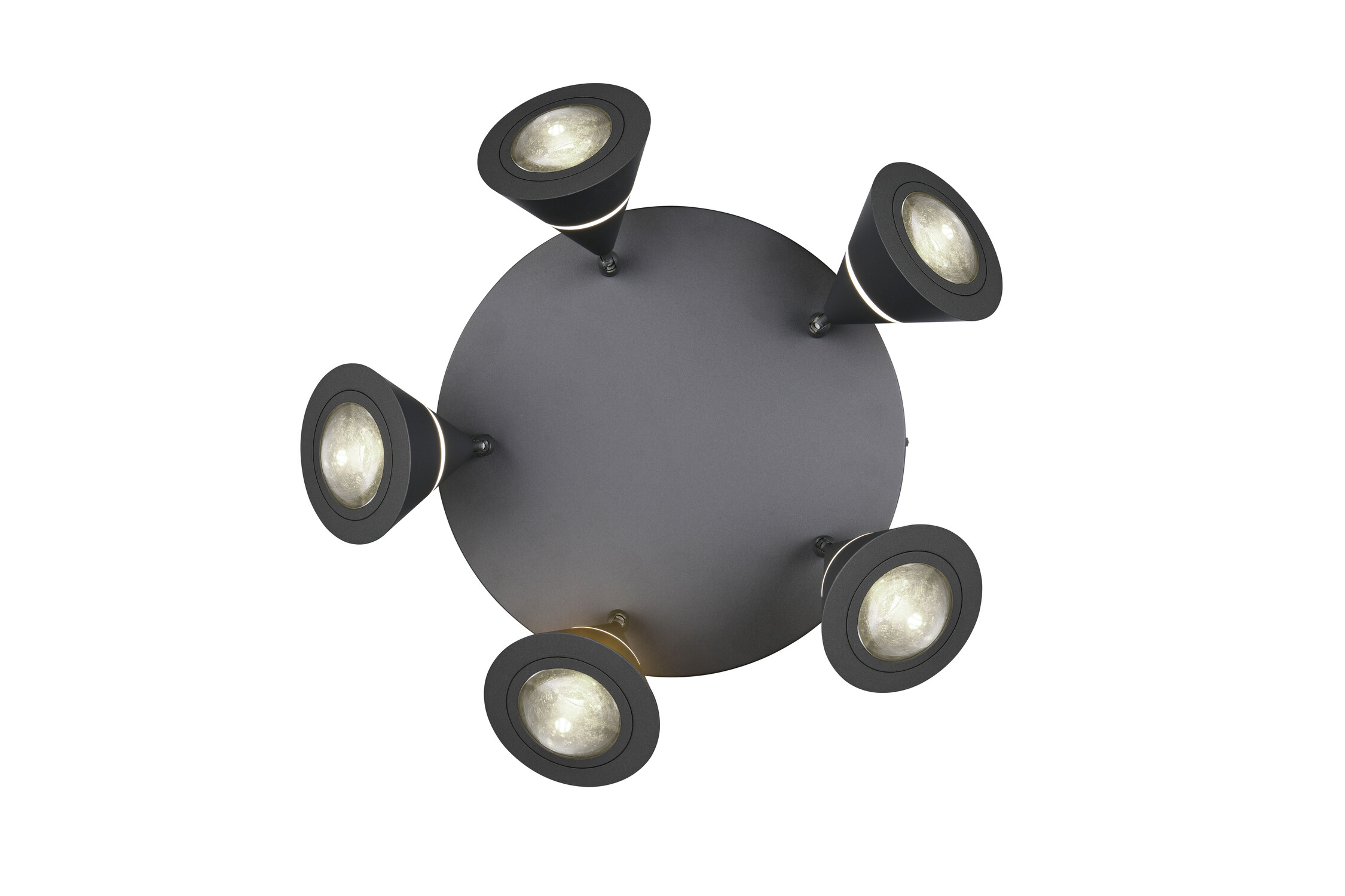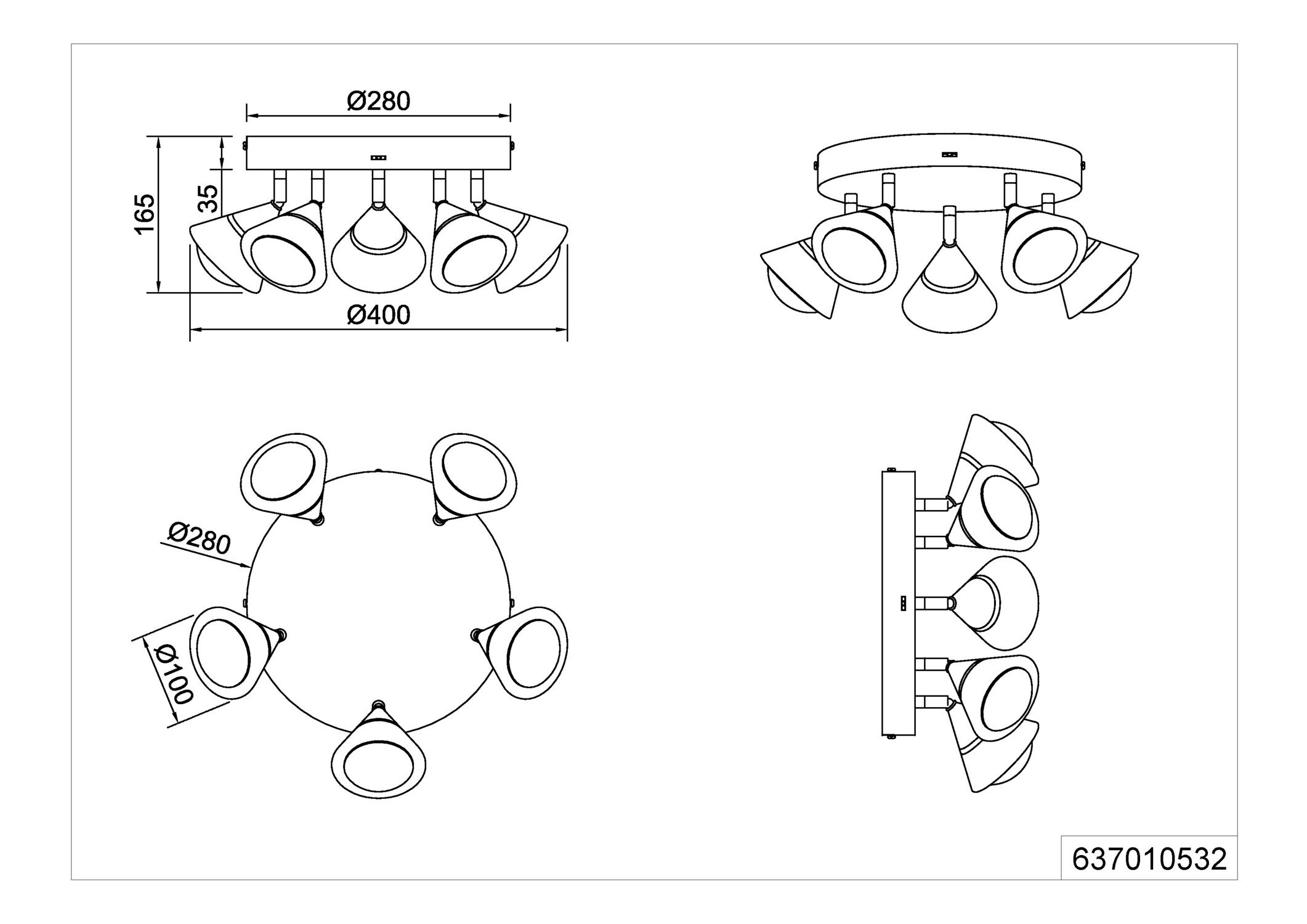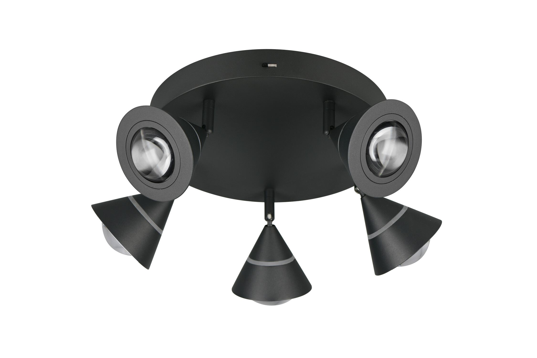 Questions Fréquentes▶ Quelle est la puissance ?5x 7W LED (3500 lumens). ▶ Hauteur du luminaire ?Fixe (env. 20 cm), idéal pour plafonds bas. ▶ Est-il dimmable ?Non, incompatible avec variateur externe. ▶ Matériau ?Métal noir mat robuste. ▶ Technologie ?LED intégrée avec choix de température de couleur (CCT). |