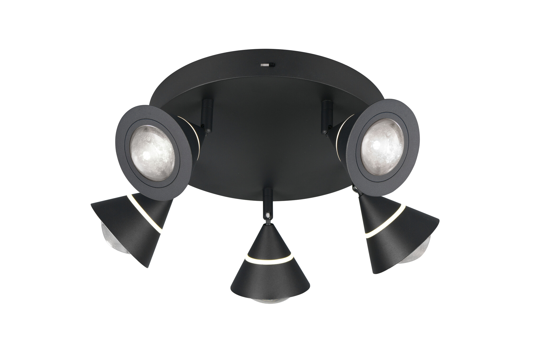 Le plafonnier graphique noir Le plafonnier ROMEO (637010532) apporte une touche industrielle chic. Ses 5 têtes coniques noires dessinent une structure lumineuse élégante au plafond.. Avec 3500 lumens, il éclaire parfaitement un salon. Notez que contrairement aux suspensions de la gamme, ce modèle est fixe (pas de Lift Me), mais conserve le choix de couleur CCT.