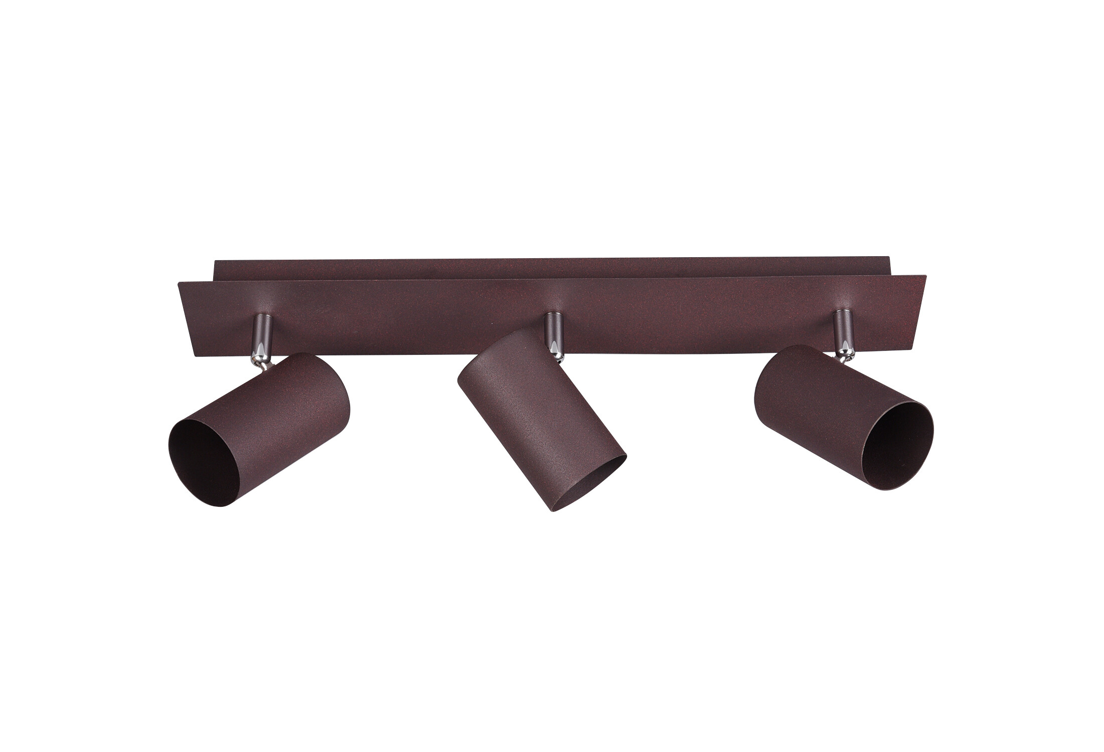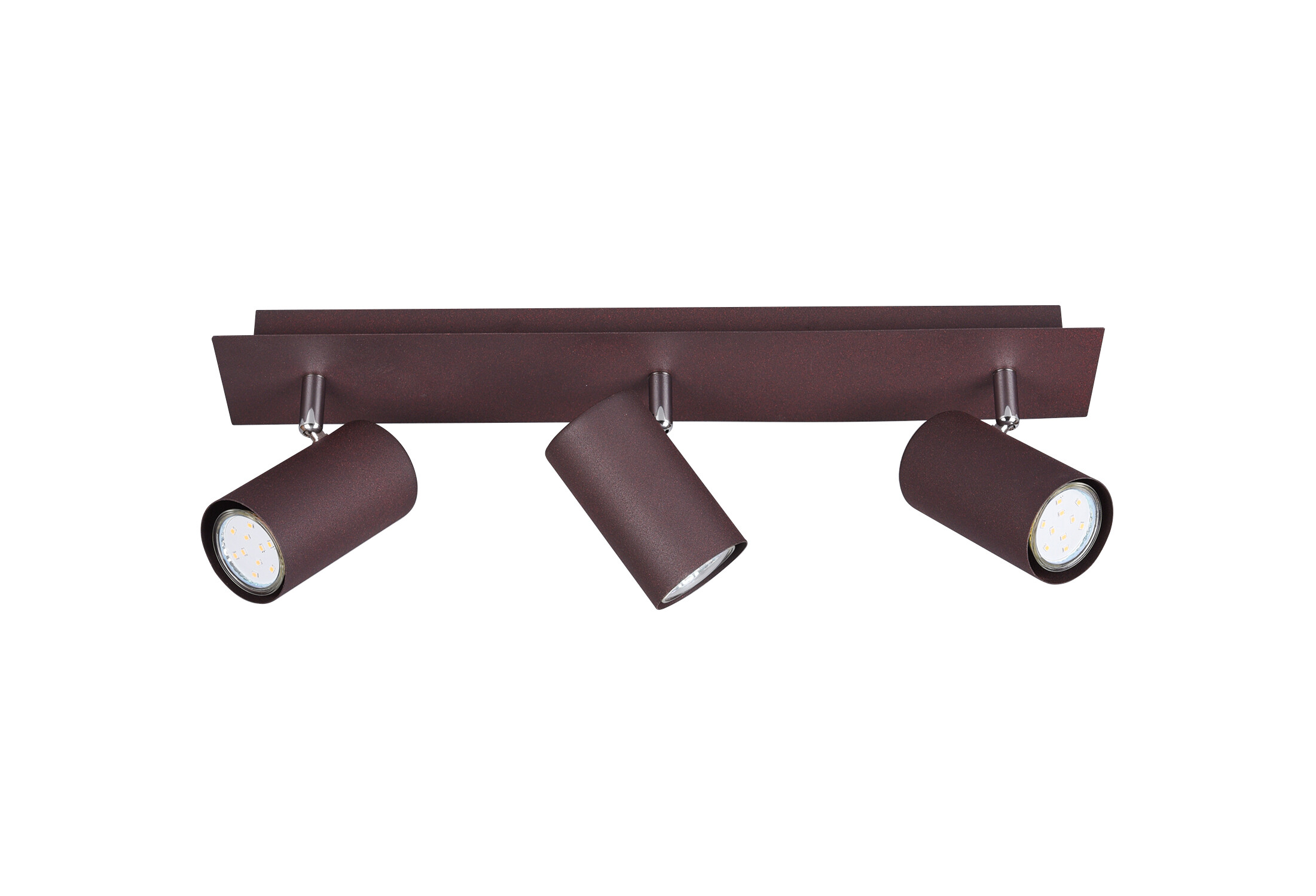 Spots MARLEY GU10 remplaçables, design minimaliste et orientable. | Type d'ampoule | Spot Gu10 (non inclus(e)) | | Puissance | max.3*10W | | Variation | Compatible | | Alimentation / Normes | 220V/Cl1 | | Dimensions | 480* 90* 150 mm | | Matière(s) Principale(s) | Métal | | Couleur/Finition | Marron rouille | | Position / Fixation | A fixer au plafond | | Utilisation | En intérieur | | Accessoire(s) | | | Garantie | 2 ans |