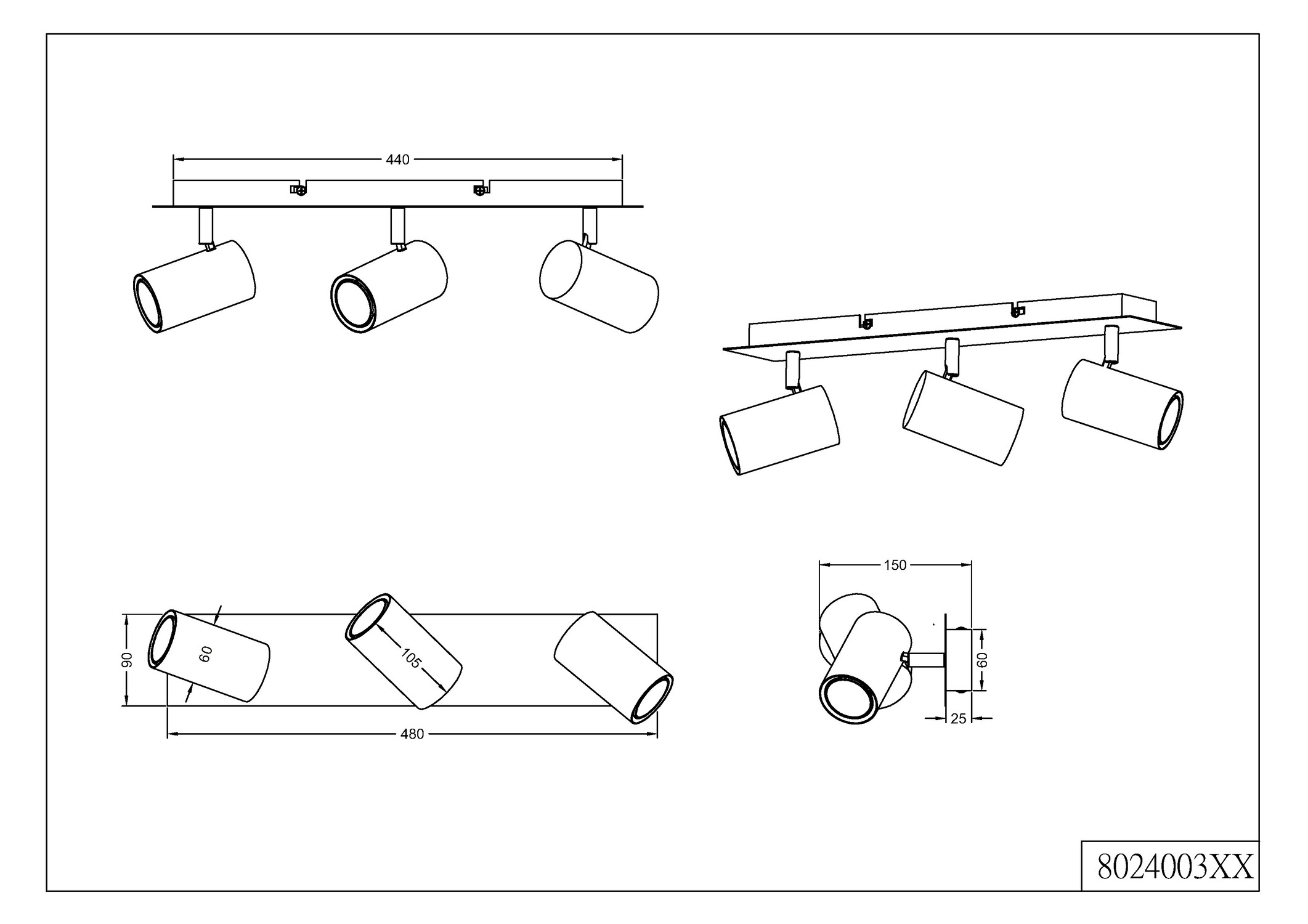 Questions Fréquentes▶ Quelle ampoule faut-il ?Trois ampoules de type GU10 (non fournies). ▶ Est-ce que l'ampoule est remplaçable ?OUI, les ampoules GU10 sont remplaçables. ▶ Peut-on orienter la lumière ?OUI, les trois têtes sont indépendamment orientables. ▶ Est-il dimmable ?OUI, si elle est équipée d'ampoules GU10 dimmables et d'un variateur mural compatible. ▶ Quelle est la puissance max ?Max 30W (3 x 10W). |