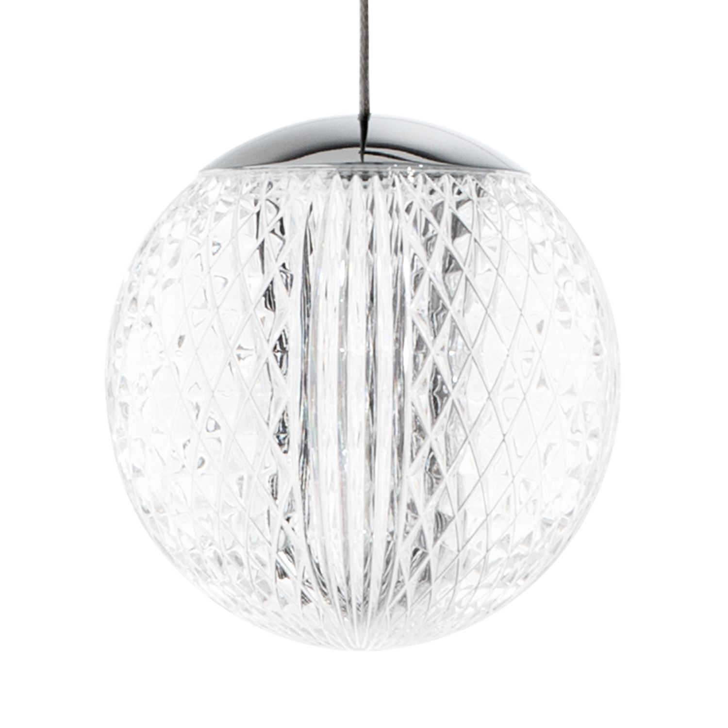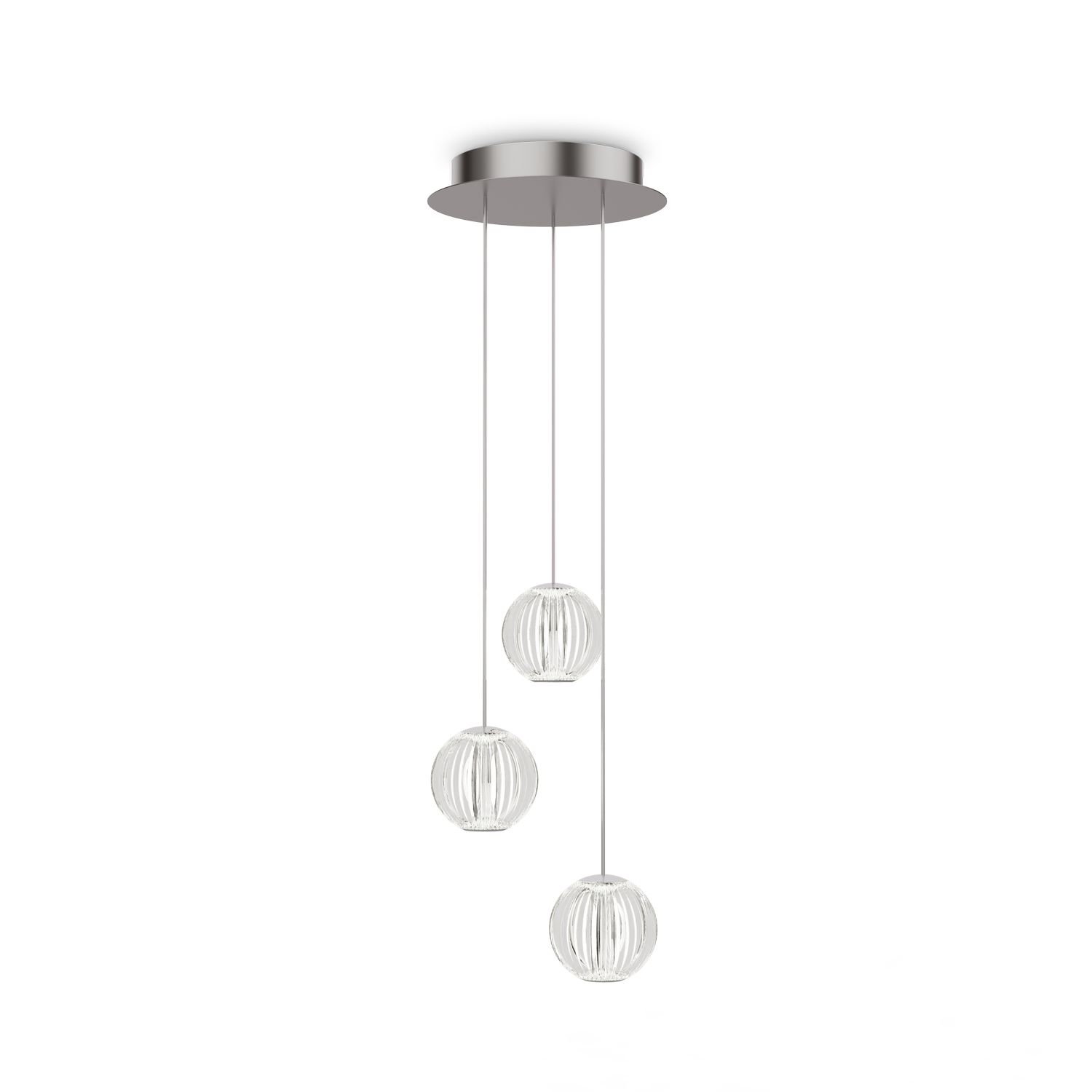 Son support rond en métal chromé accueille trois diffuseurs en acrylique transparent effet cristal, suspendus par un fil transparent.