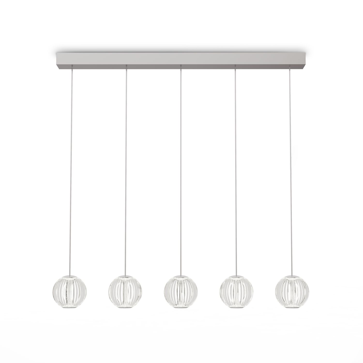 Sa structure en métal chromé supporte cinq diffuseurs en acrylique transparent effet cristal, dont les facettes captent et reflètent la lumière avec intensité. Le fil transparent renforce l’effet aérien de la composition.