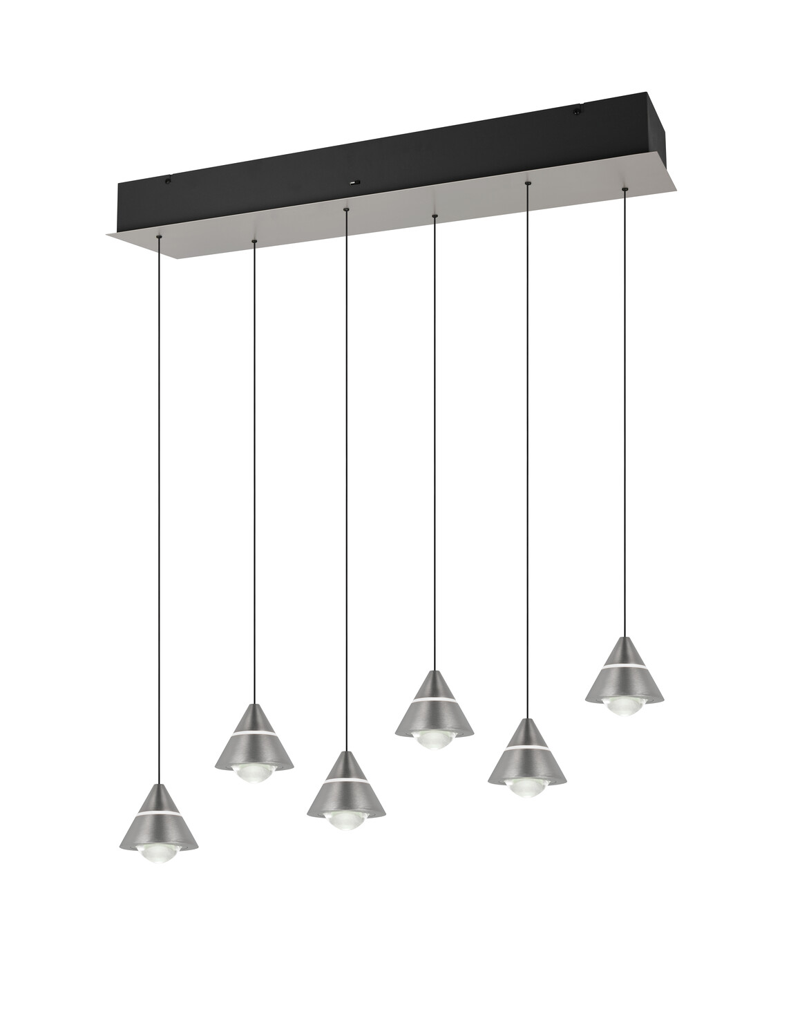 La symphonie lumineuse modulable La suspension ROMEO (337010607) est spectaculaire. Sur sa base rectangulaire, 6 spots coniques peuvent être montés ou descendus chacun indépendamment des autres grâce au système Lift Me.. Créez une vague, une ligne droite ou un chaos organisé au-dessus de votre table. Puissante (4200lm) et équipée du CCT (choix de couleur), c'est le luminaire ultime pour les grandes salles à manger.