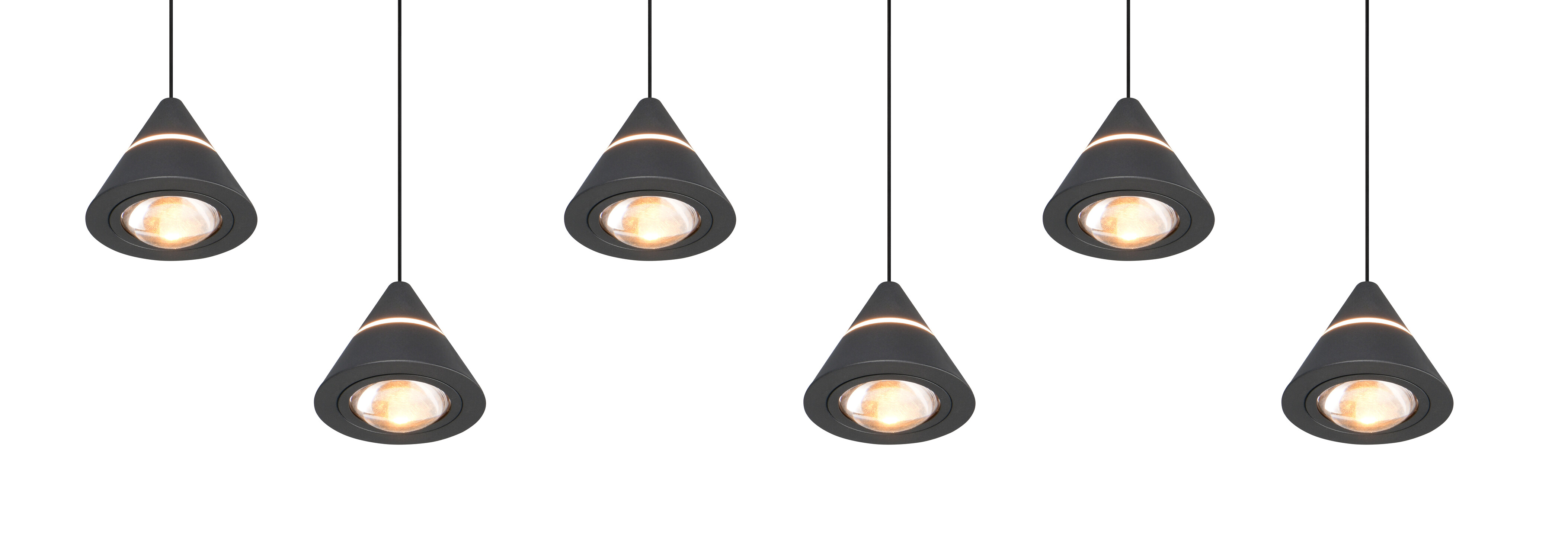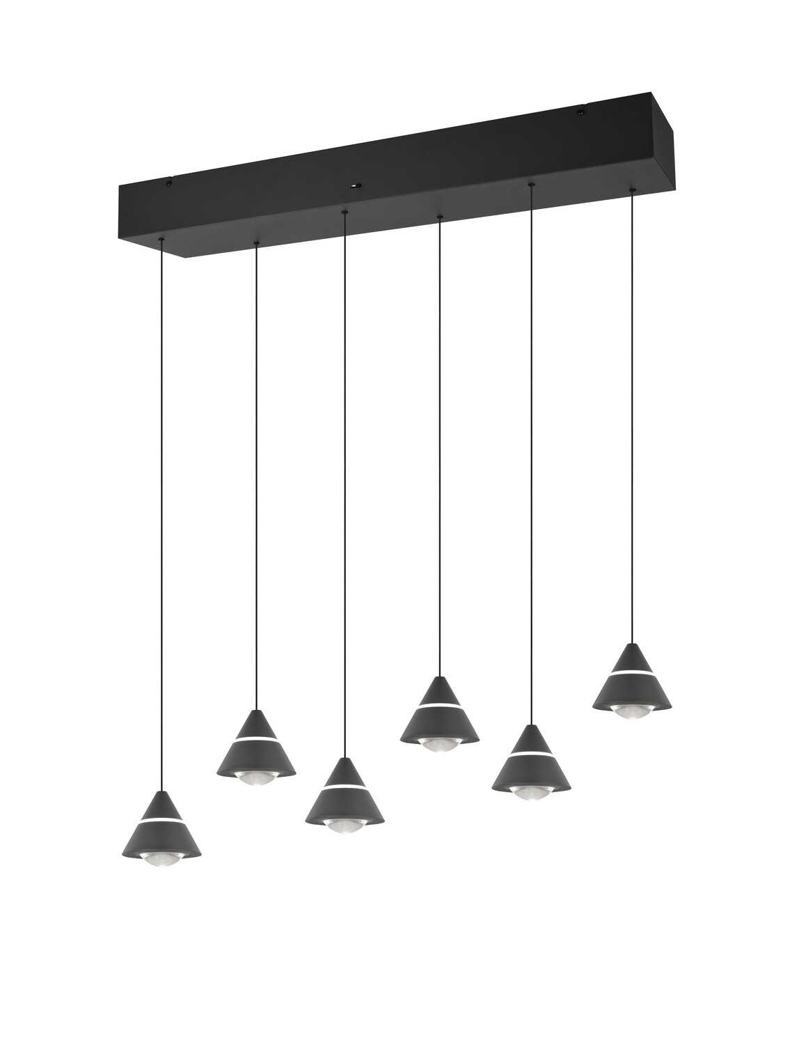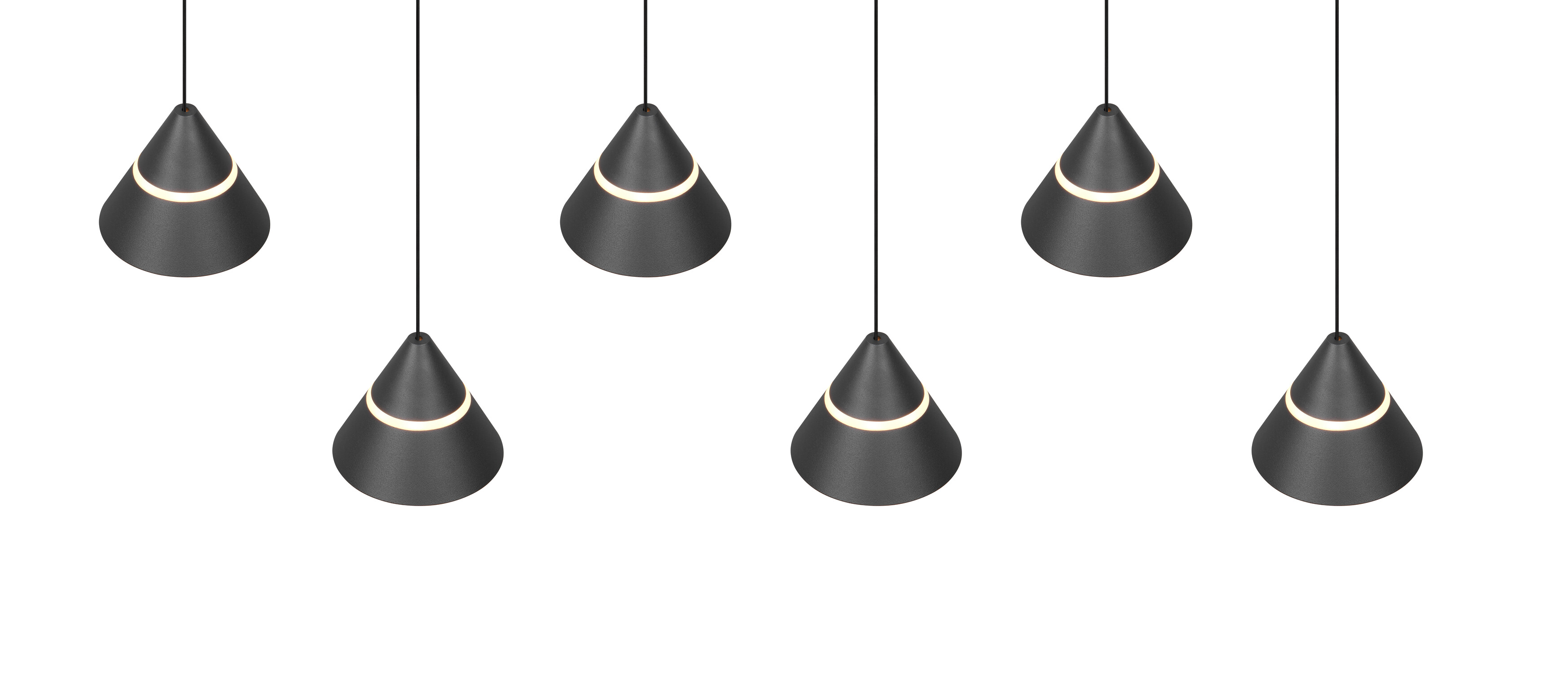 Le lustre noir 100% ajustable La suspension ROMEO (337010632) change d'aspect selon vos envies. Avec le système Lift Me, ajustez la hauteur de chacun des 6 cônes noirs indépendamment pour sculpter votre éclairage.. Puissante (4200 lumens) et élégante, elle offre aussi le choix de la température de lumière (CCT). Une pièce maîtresse pour les intérieurs contemporains.