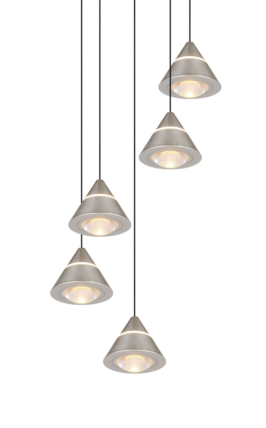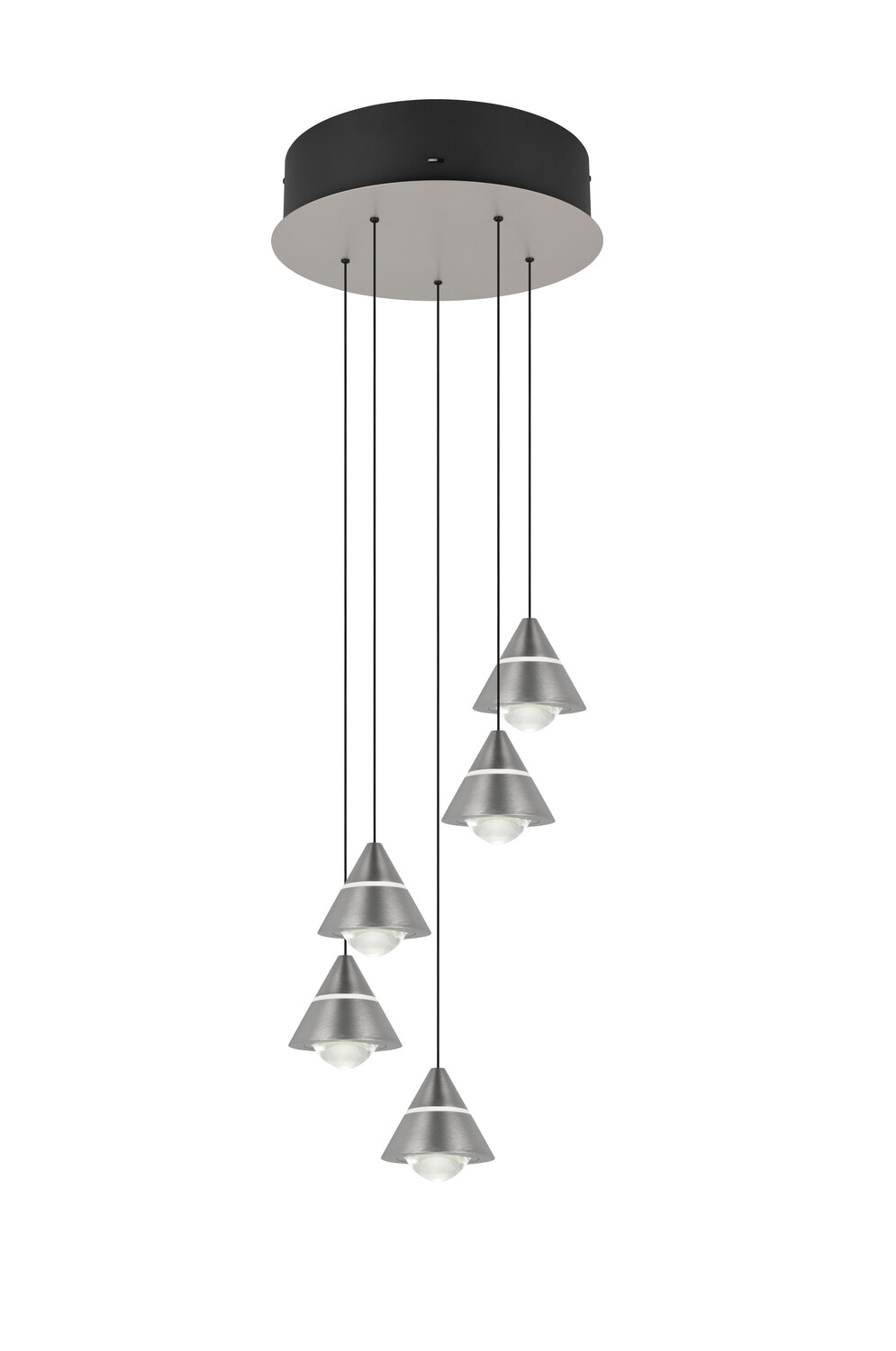 La cascade ajustable à l'infini La suspension ROMEO (337030507) est ludique et élégante. Grâce au système Lift Me, modifiez la hauteur de chacun des 5 spots coniques indépendamment pour créer une grappe, une spirale ou une pluie de lumière personnalisée.. Sa base ronde en nickel mat s'intègre partout. Profitez de la technologie CCT pour choisir une lumière chaleureuse ou neutre selon le moment.
